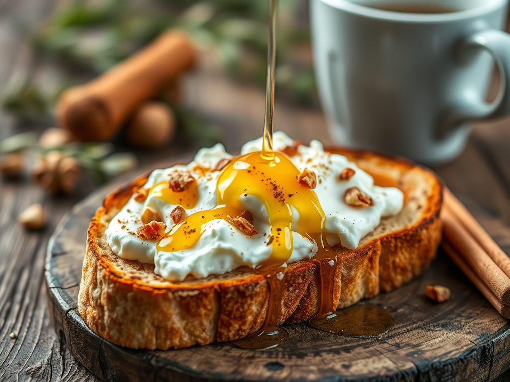 Toast one slice of bread. Spread with ricotta. Drizzle with honey. Add cinnamon or crushed nuts if you’re feeling brave.