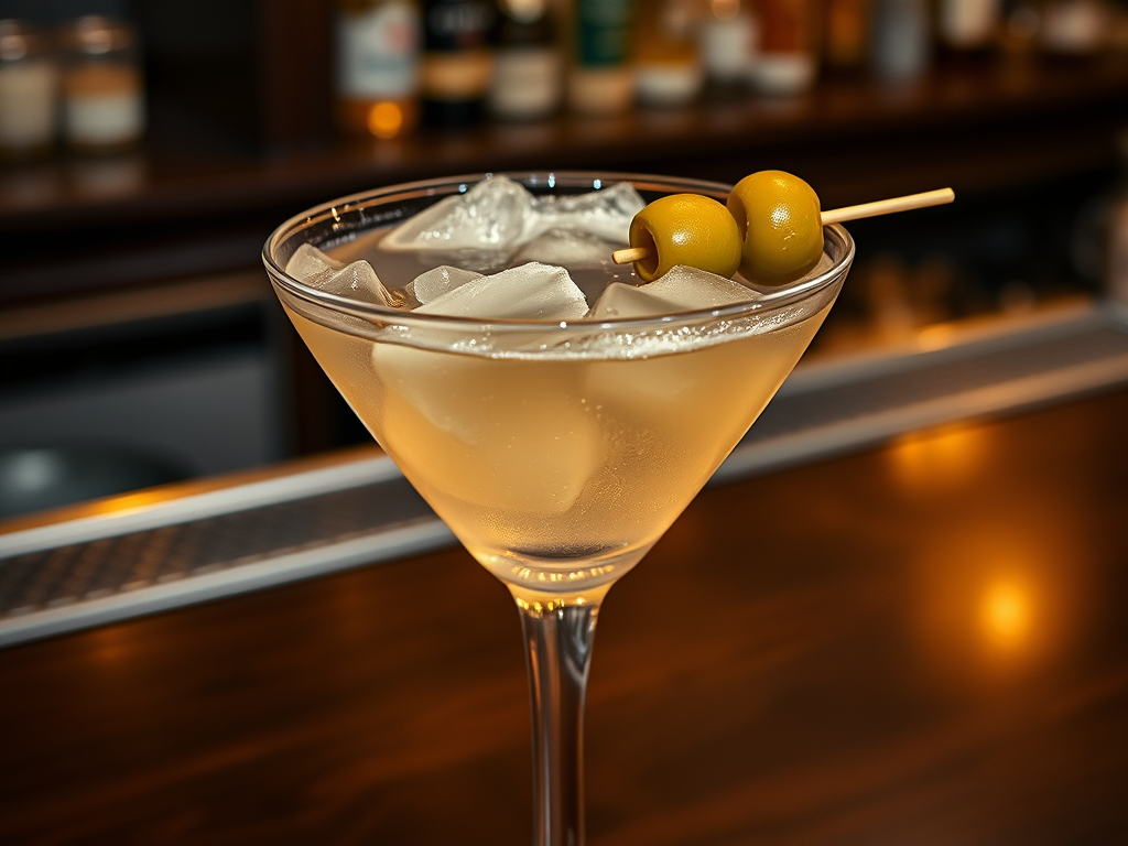 Ingredients: 60ml vodka or gin, 10ml vermouth, 10ml olive brine, olive to garnish