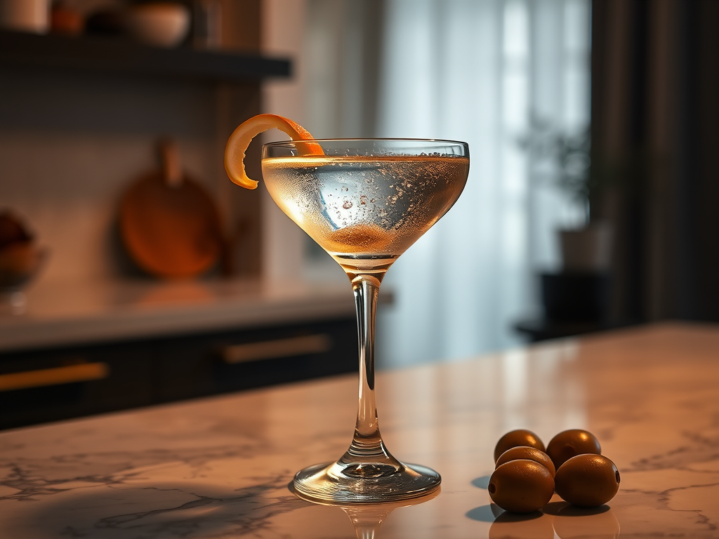 Ingredients: 60ml gin, 10ml dry vermouth, lemon twist or olive