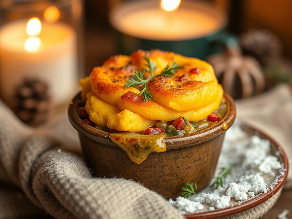 Spoon the lamb filling into a lightly greased ramekin or small oven-safe dish. Top with mashed sweet potato and smooth with the back of a spoon. For extra browning, drag a fork across the top for ridges.