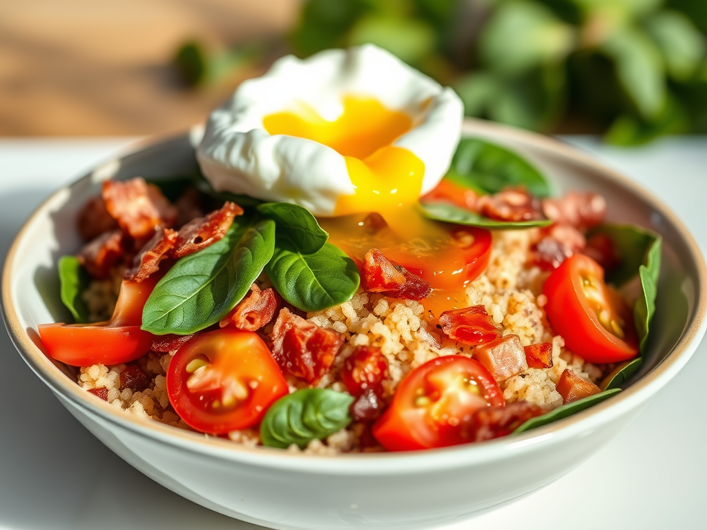 Think of it as a warm, hug-in-a-bowl kind of meal. The fluffy quinoa soaks up the tomato juices, the spinach adds a fresh green pop, the crispy bacon brings smoky savouriness, and then—because we’re classy—we crown it with a perfectly poached egg.